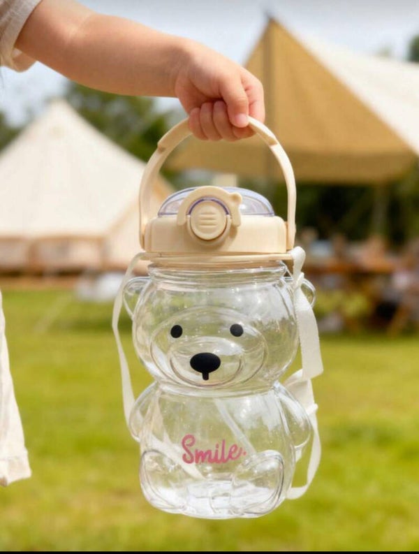 1pc 1000ml Cute Bear Shaped Water Bottle, Large Capacity Sports Water Cup With Strap To Carry On Body Or Hand, Cartoon Flip Cap With Straw, Adorable & Portable For Outdoor Camping, Driving, Cycling, Short Trips